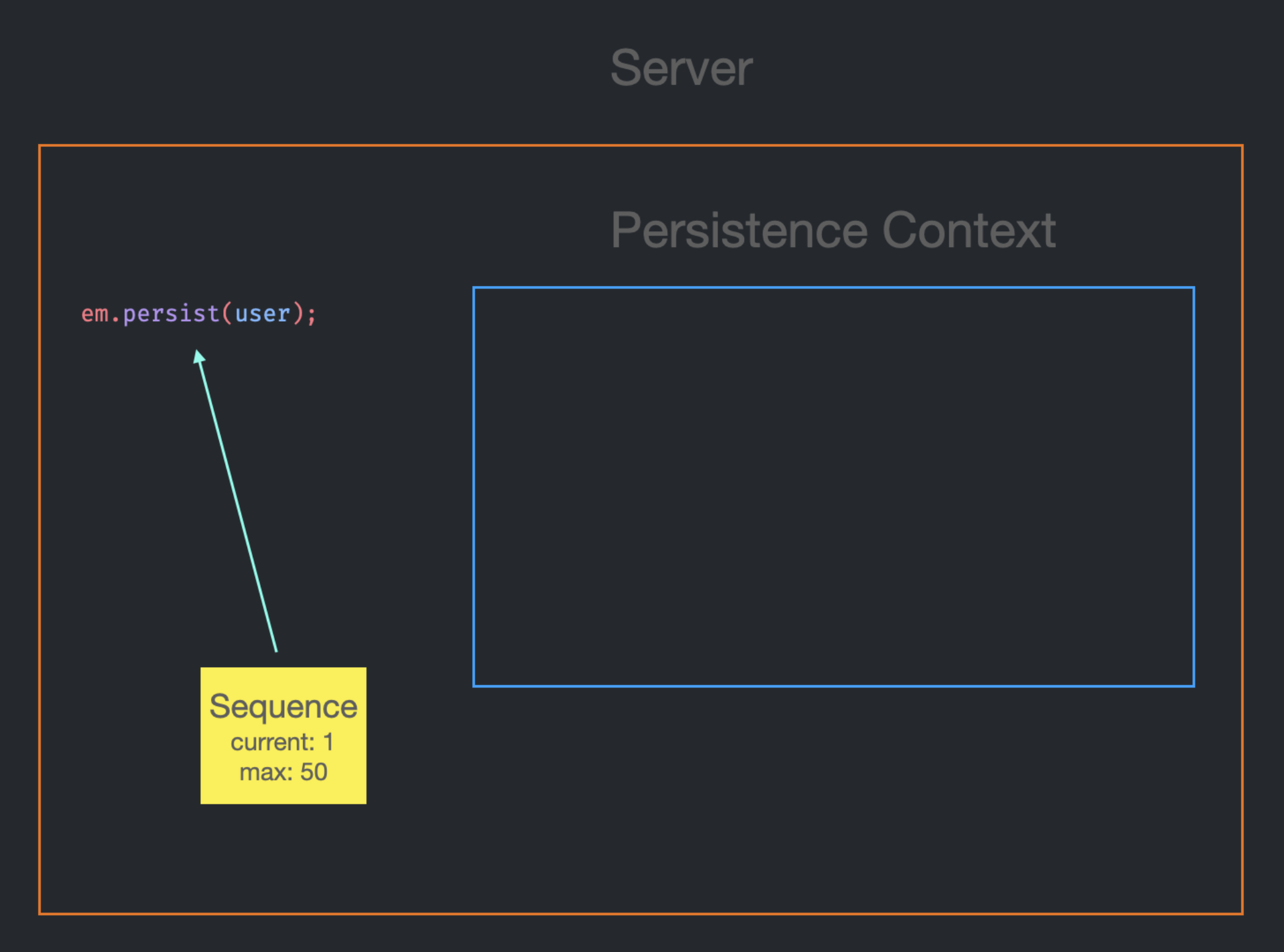 em.persist를 호출할 때마다 sequence로부터 current 값을 받고 current는 1을 증가시킨다.