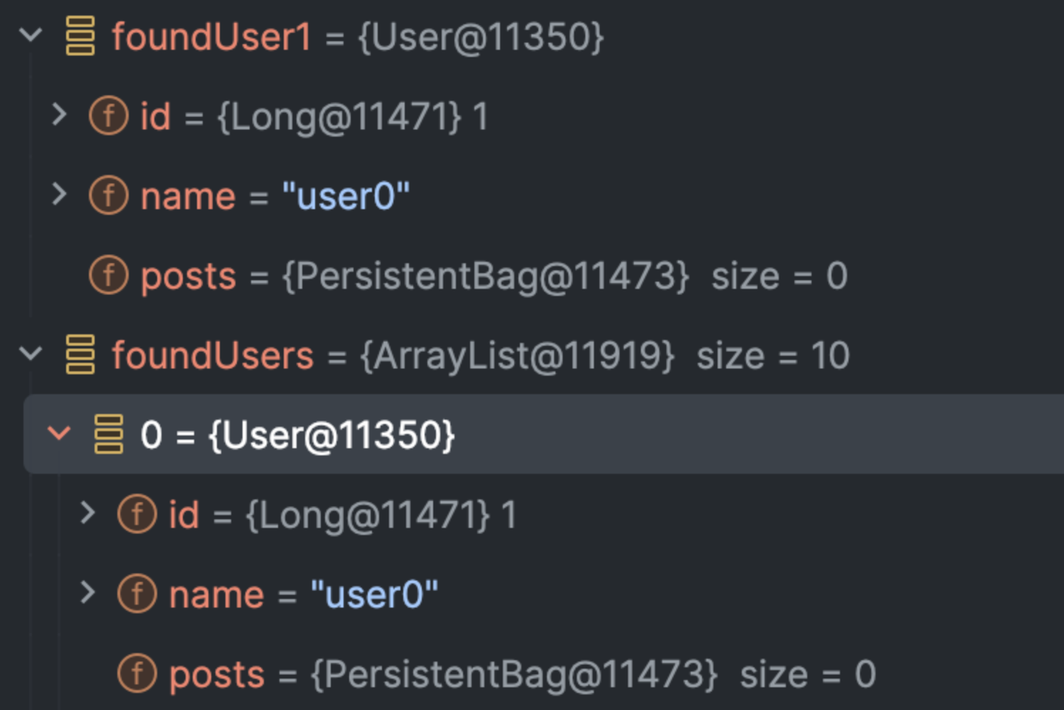 (foundUser1이 Persistence Context에서 가져온 Entity, foundUsers[0]이 DB에서 가져온 Entity)
