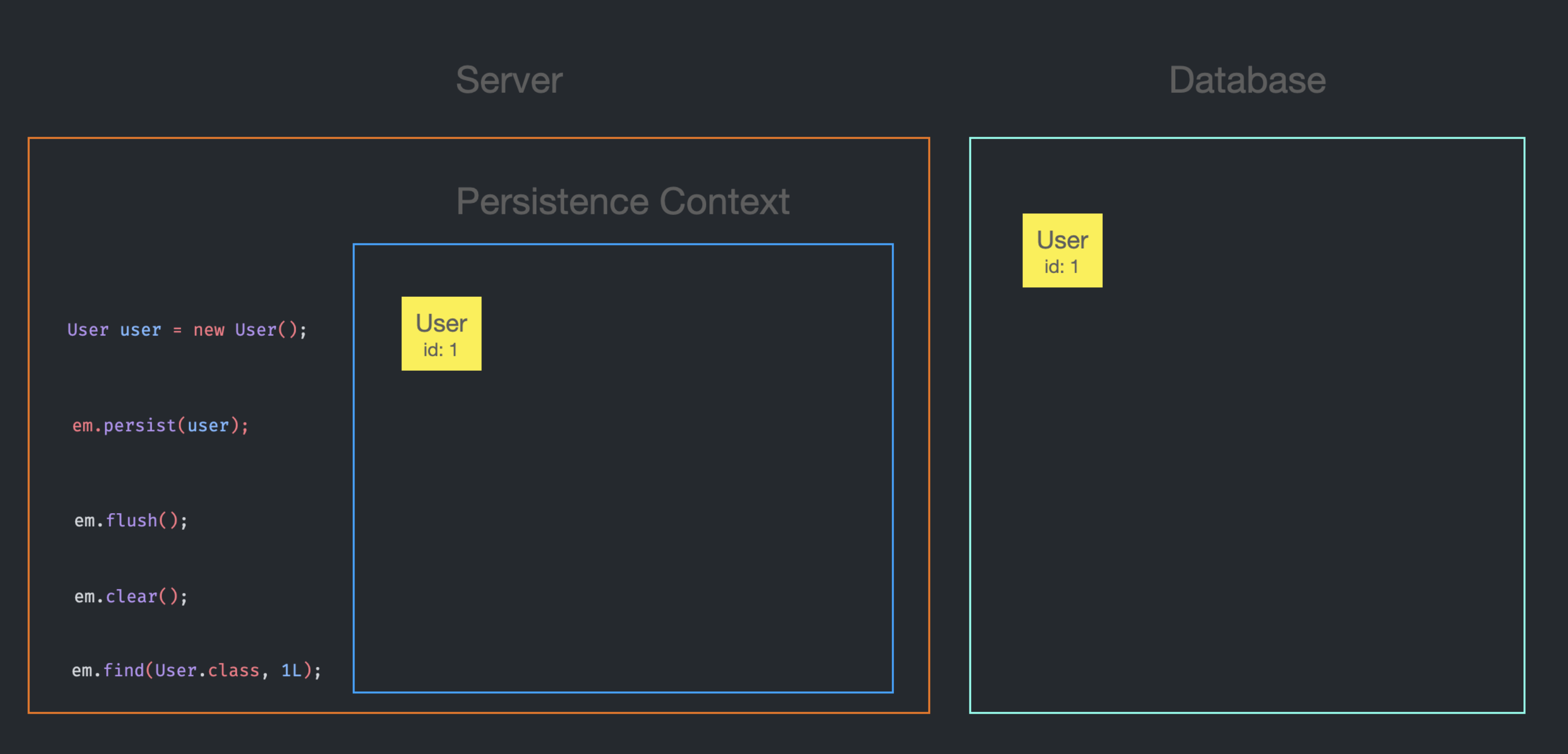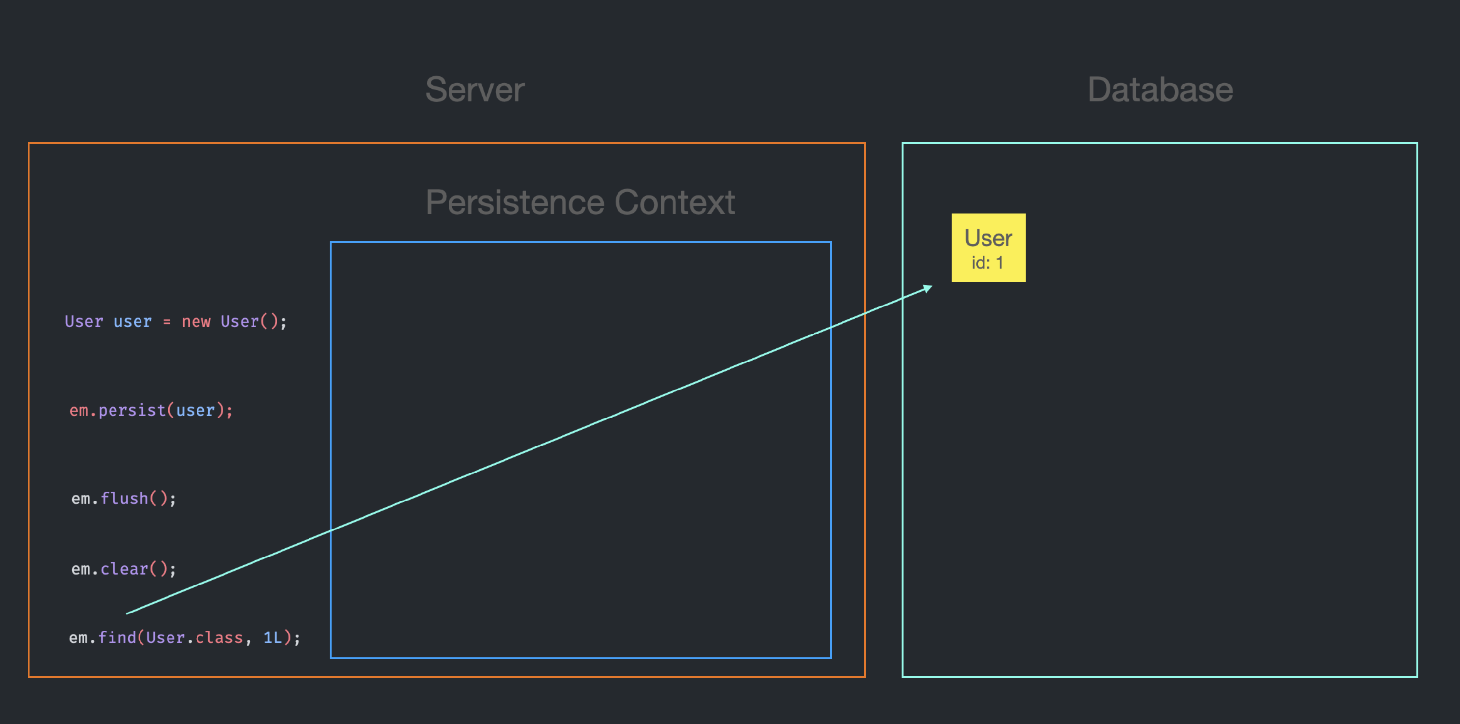 이러면 다음번에 em.find로 동일한 id를 가진 User를 찾을 때, DB 호출을 보낼 필요가 없을 것이다. Persistence Context에 찾아오면 되니까.