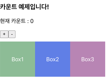 위의 UI에서 Box1에 count를 초기화 해주는 버튼을 추가하고, 초기화하는 함수를 App.jsx로 부터 내려준다.