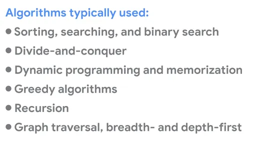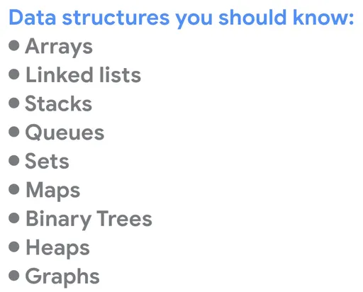 다음은 구글에서 업로드한 위 interview tip 영상에 언급된, 인터뷰이가 알아야 하는 자료구조와 알고리즘 목록입니다.
