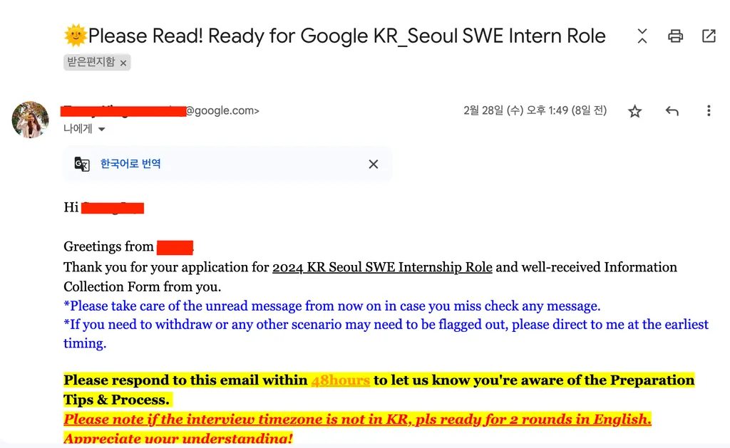 지난 달에 에타 학과 게시판에 현직자 선배님이 구글 여름 인턴 뽑는 중이라고 글 올려주신 걸 봤다. 될 가능성은 없다고 생각했지만 지원하는 건 무료고 ict 글로벌 인턴 준비하면서 영문 레쥬메 써둔 것도 있고 해서 걍 회사 이름만 구글로 바꿔서ㅋㅋㅋㅋ 제출했다.
