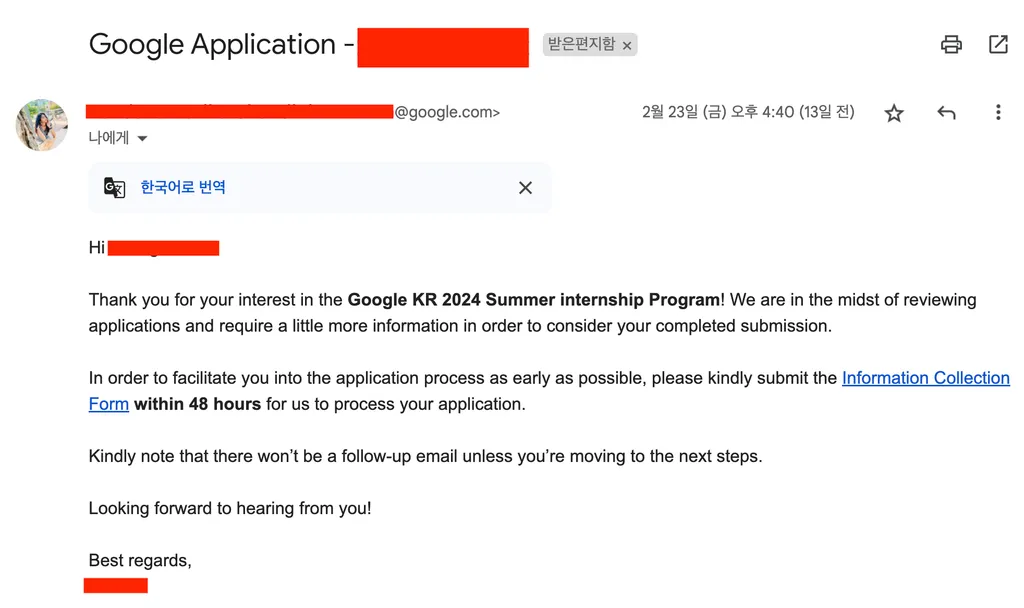 뭐 아무튼 제출하고 손가락 빨고 있었는데 한 3일쯤 뒤에 정말로 구글 직원분께 메일이 왔다.
