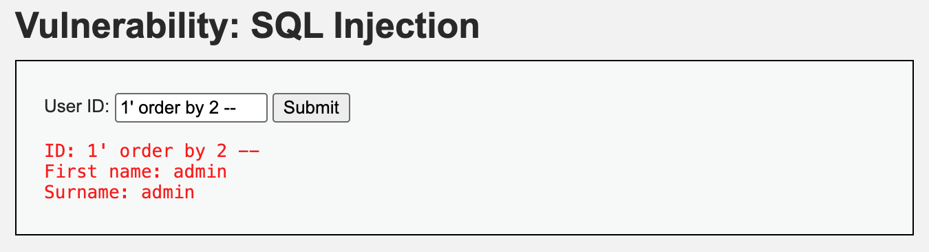 SELECT first_name, last_name FROM users WHERE user_id = '' OR '1' order by 2 --';user_id가 공백이거나 1인 first_name과 last_name을 출력하는데 2번째 컬럼으로 정렬을 합니다