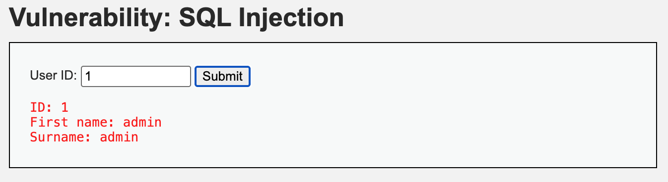 1을 넣었더니 ID와 First name, Surname이 출력되는 것을 확인할 수 있습니다
