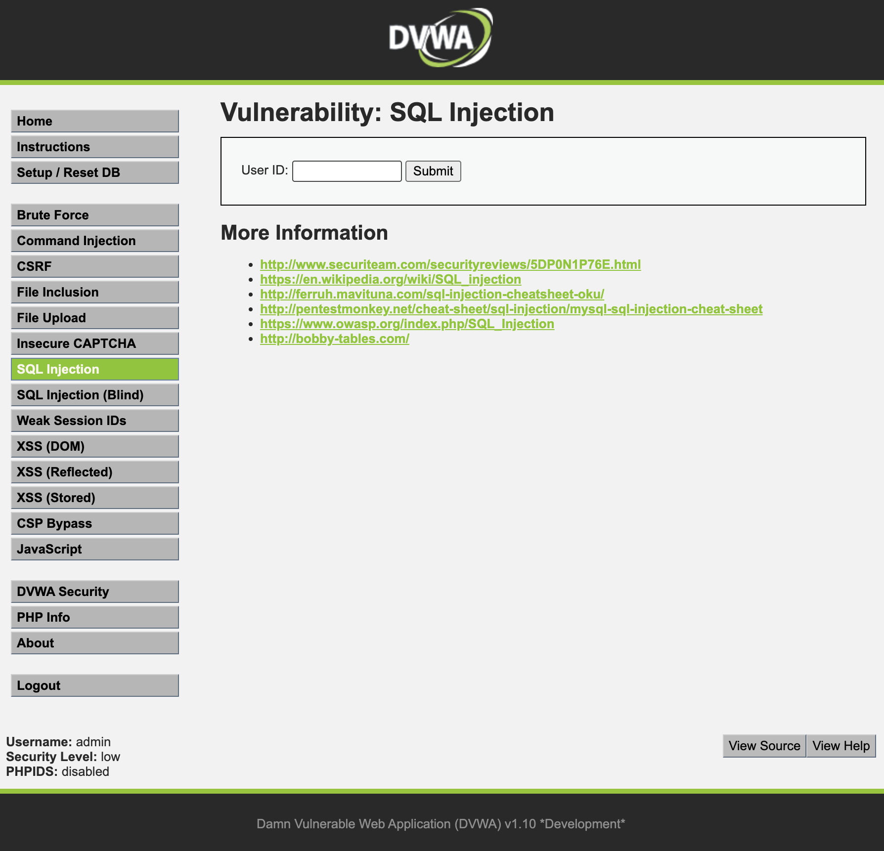 우선 Docker를 통한 DVWA 웹 서버 구축하기 를 완료했다면 이제 로그인을 한 후 SQL Injection으로 들어가봅시다