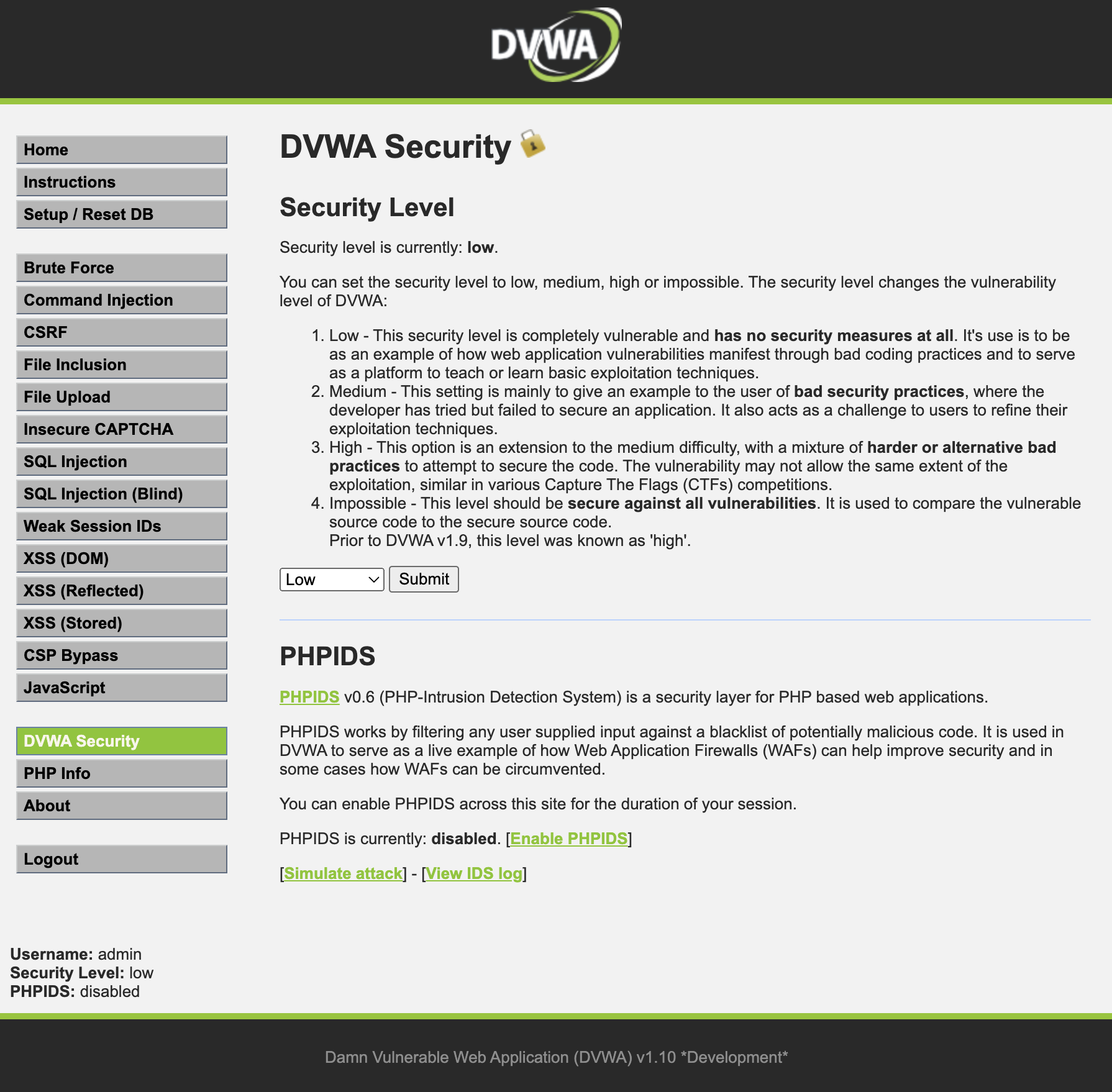 마지막으로 DVWA Security를 눌러 보안 레벨을 설정해줍시다