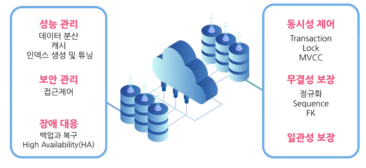 | 안전성 | - 접근하는 사용자마다 다른 권한을 부여하는 접근통제기능 - 데이터가 잘못 수정/삭제되었을 때 백업하는 기능 |
