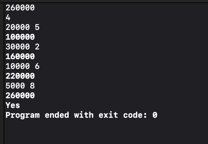 구매한 물건의 가격과 개수로 계산한 총 금액이 영수증에 적힌 총 금액과 일치하면 Yes를 출력한다. 일치하지 않는다면 No를 출력한다.