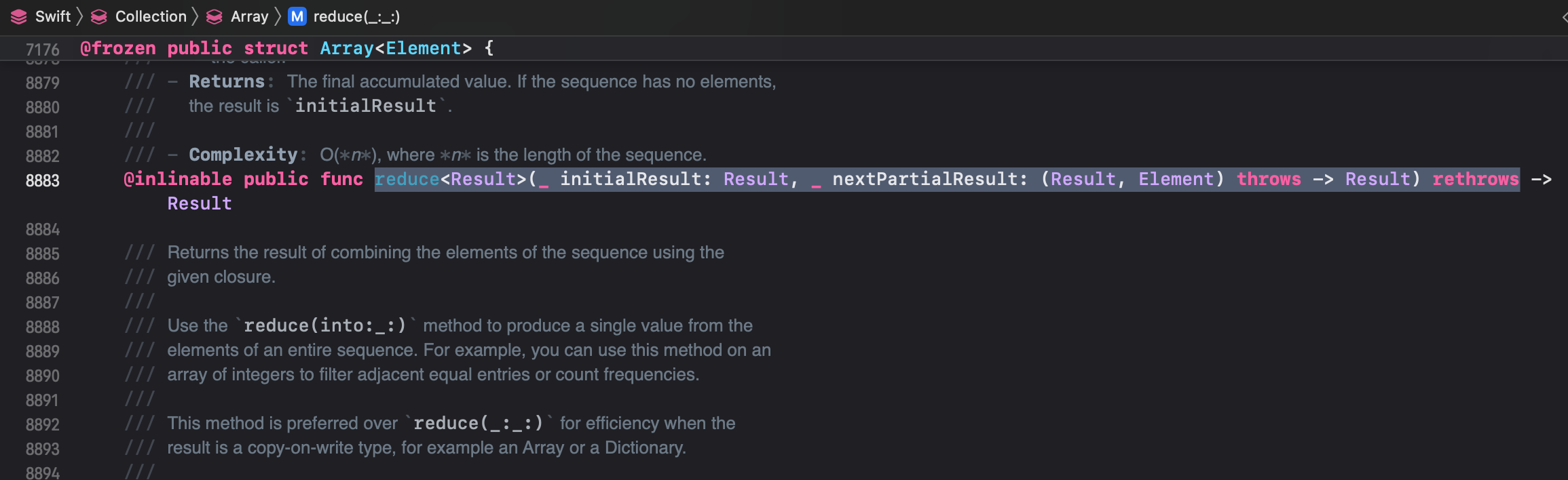 let sum: Int = someNumbers.reduce(0, { (first: Int, second: Int) -> Int in