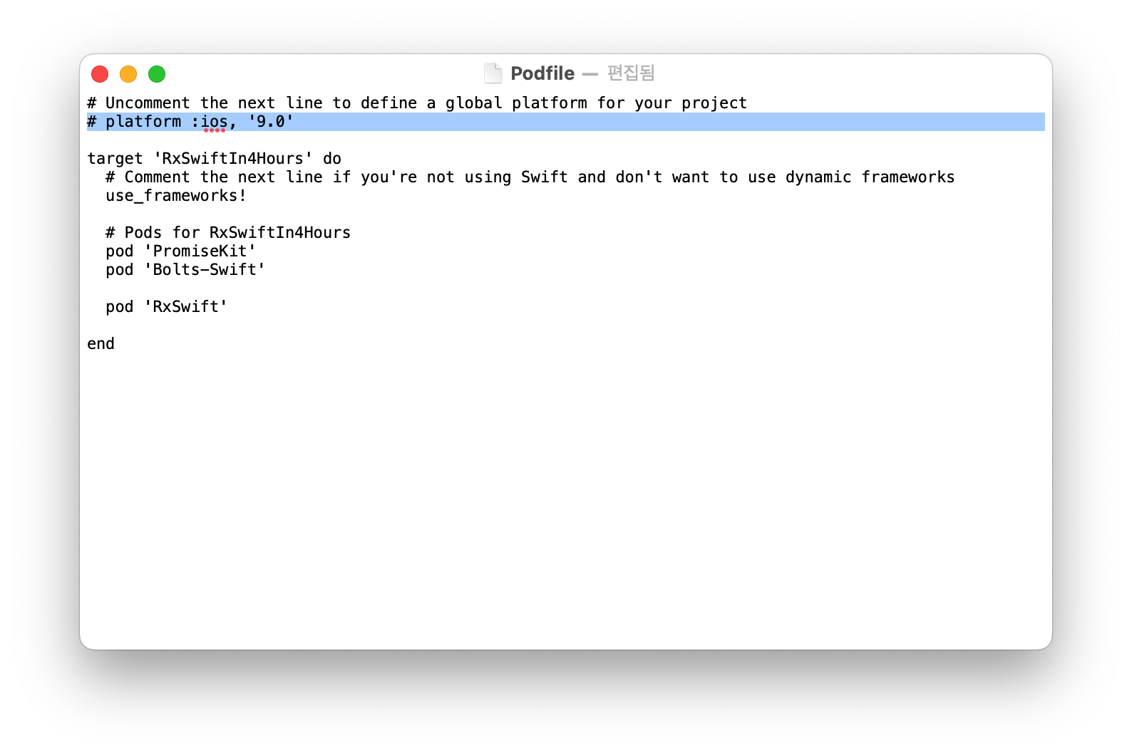 [!] 대상 'RxSwiftIn4'에서 버전 '12.1'의 플랫폼 'iOS'를 자동으로 할당하는 중플랫폼이 지정되지 않았기 때문에 시간입니다. 포드 파일에서 이 대상에 대한 플랫폼을 지정하십시오. https://guides.cocoapods.org/syntax/podfile.html#platform을 참조하십시오.