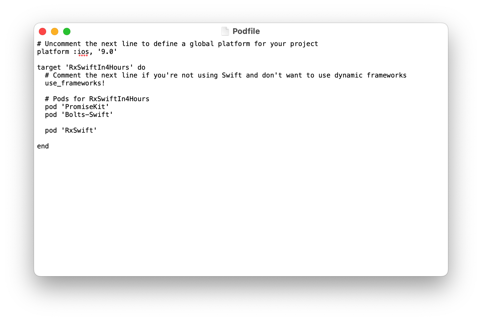 iOSwith version12.1on targetRxSwiftIn4Hoursbecause no platform was specified. Please specify a platform for this target in your Podfile. Seehttps://guides.cocoapods.org/syntax/podfile.html#platform.