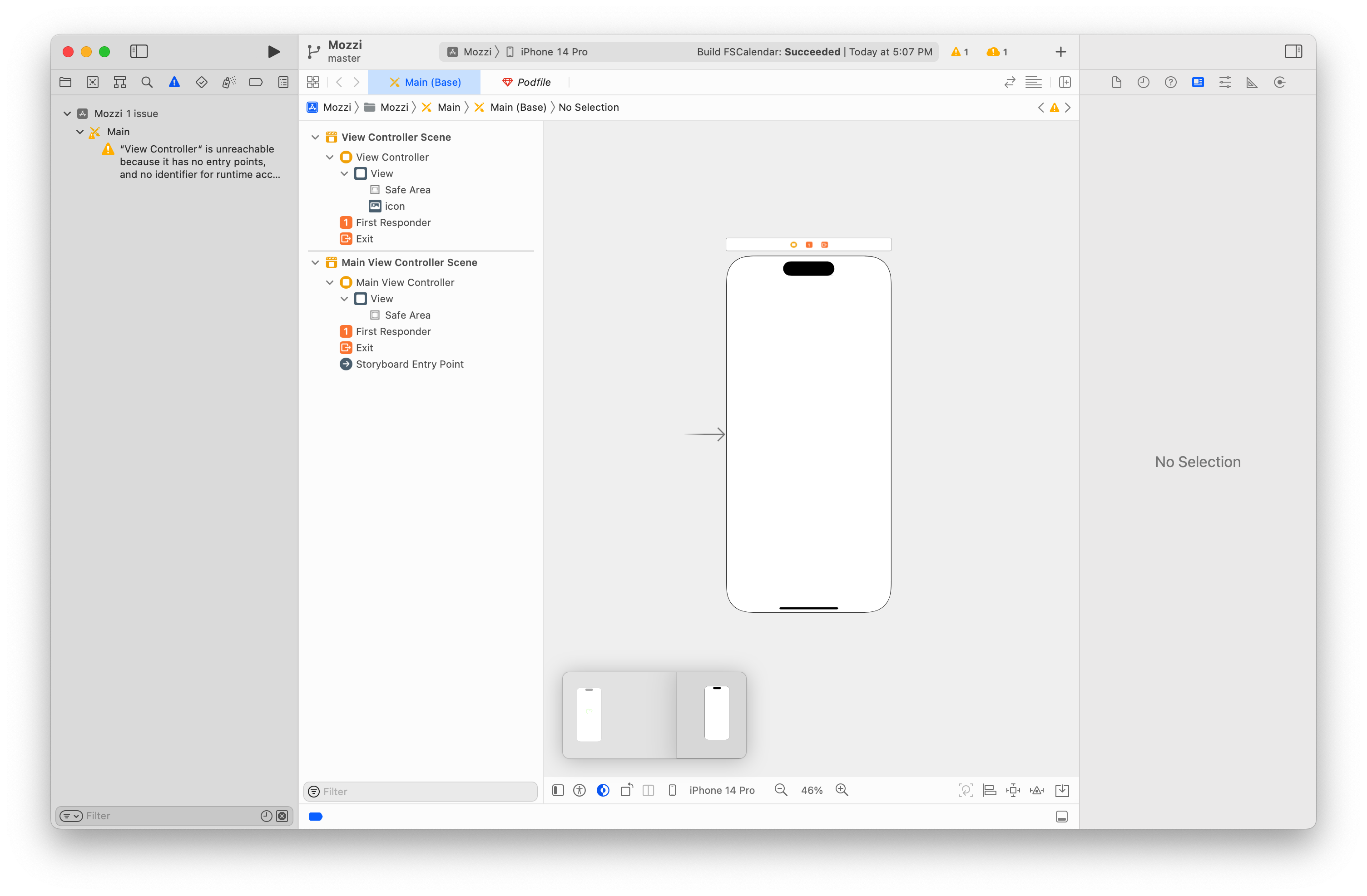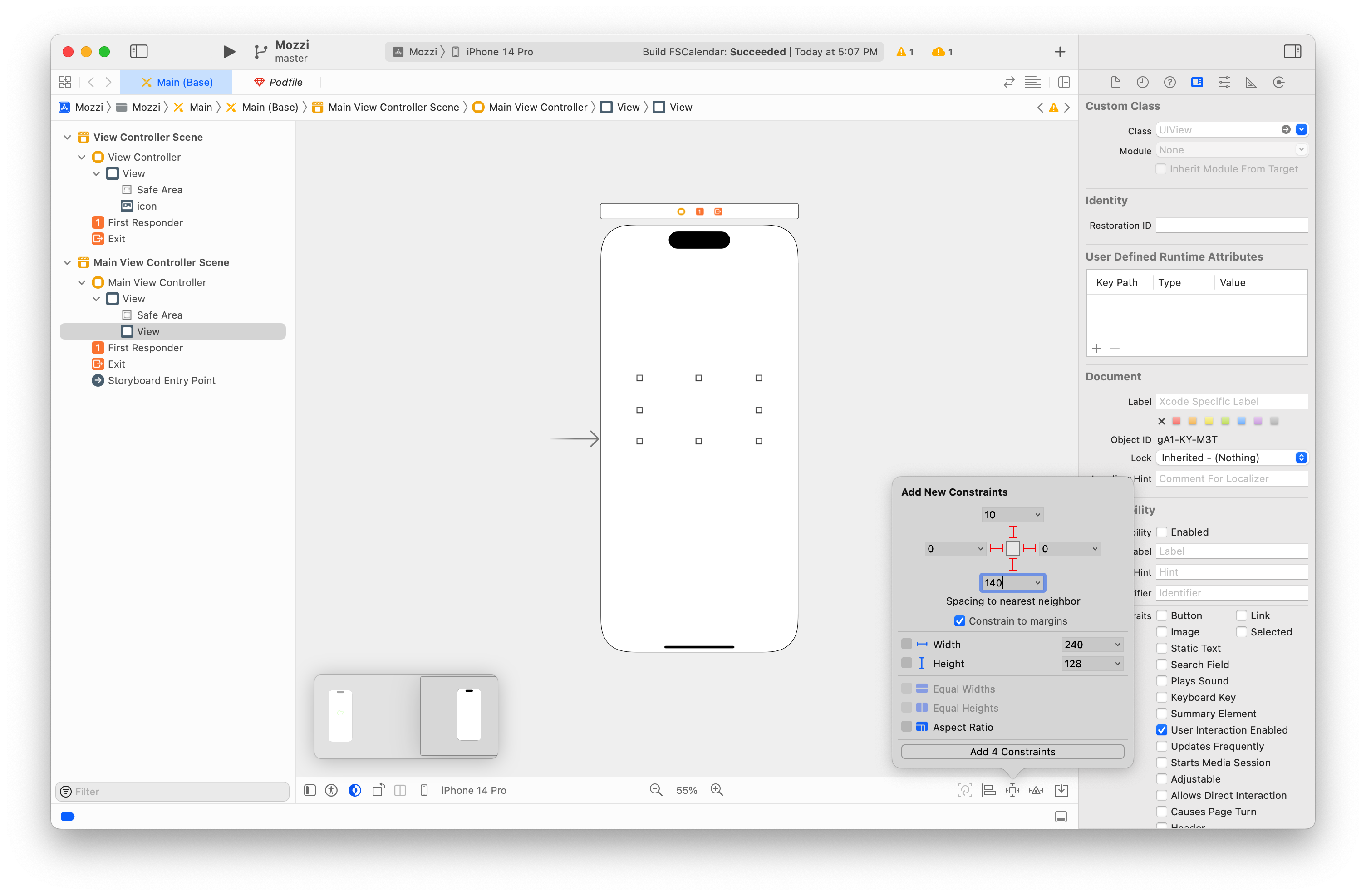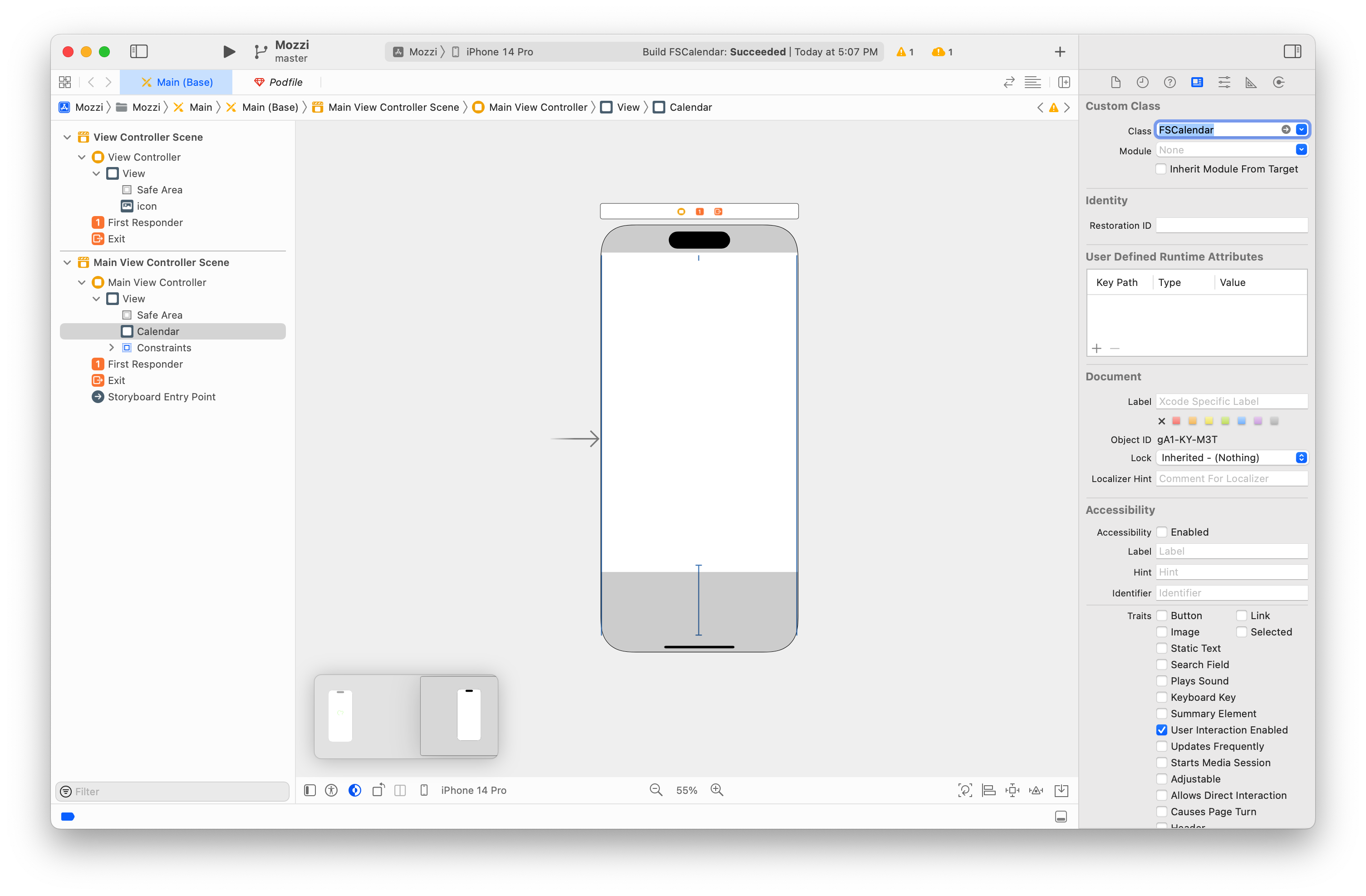 인스펙터 영역(Inspector Area)에서 커스텀 클래스(Custom Class) 입력란에 "FSCalendar"를 입력