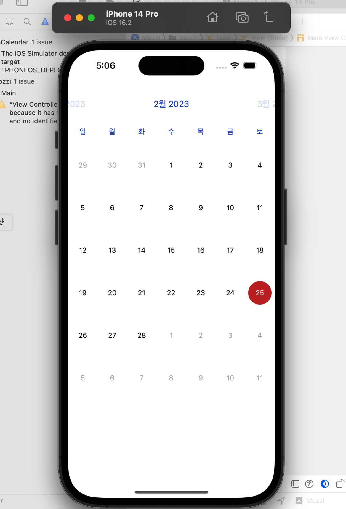 실행하면 캘린더가 완성 (원래는 스토리보드상에서도 보여야 하는데 오류인건지 스토리보드상에서는 확인이 안된다🥲)