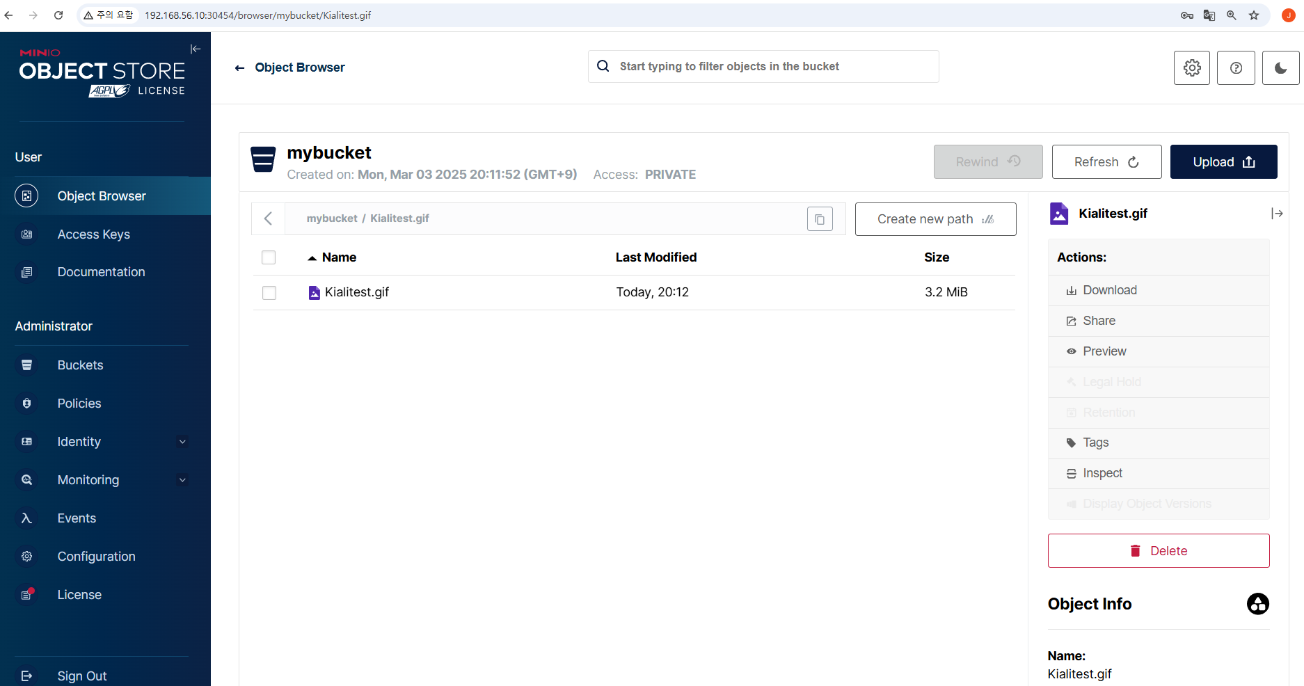 버킷하나 만들고 파일을 올려 정상 작동하는 지 확인한다.