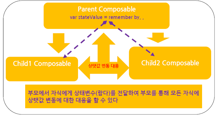 - 부모 컴포저블에서 자식 컴포저블로 상태 값을 전달하는 방식이며 컴포저블 함수 재사용성 향상