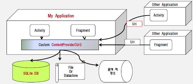 위치(Uri) 및 타입(type)와 함께 공유 자료에 대한 추가, 삭제, 갱신 및 자료에 대한 결과 집합 등을 ContentProvider를 상속받아 재정의 함으로써 제공