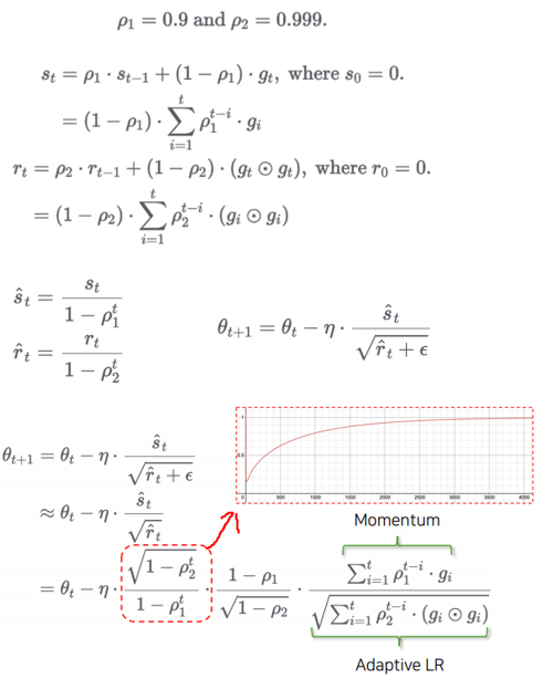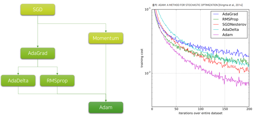 | Adam | Momentum + AdaGrad, ๋์ ์ฑ๋ฅ |