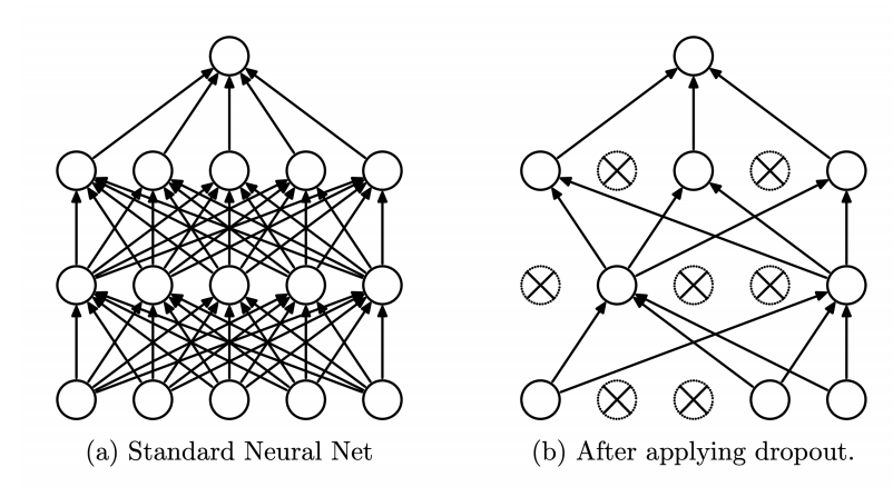 - ๊ณผ์ ํฉ(overfitting)์ ๋ง๊ธฐ ์ํ Regularization ๊ธฐ๋ฒ ์ค ํ๋๋ก, ํ์ต ์ ์์๋ก ๋ด๋ฐ์ ๋นํ์ฑํํ์ฌ ํน์ ๋