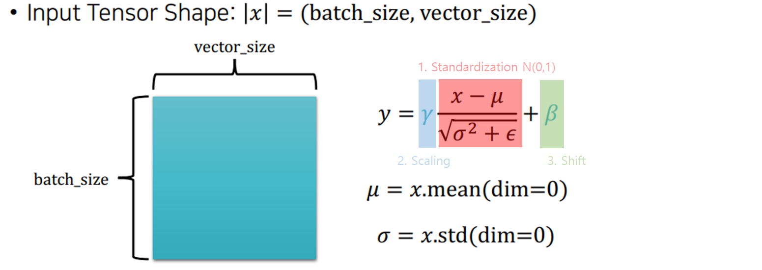 ๋ ฅ์ ์ ๊ทํ(Standardization)ํ scaling(ฮณ), shifting(ฮฒ) ํ๋ผ๋ฏธํฐ๋ก ๋ณด์