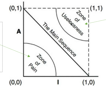 - (A=1, I=1): 추상적이지만 의존성 없는 컴포넌트 → Zone of Uselessness (사용되지 않음)