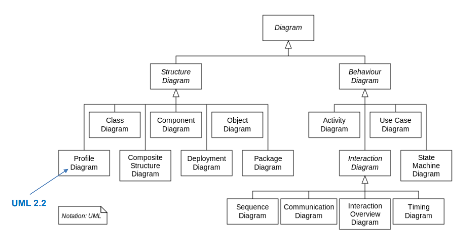 UML 2.x 버전은 총 13개의 다이어그램으로 구성되며, 이는 시스템의 정적인 구조와 동적인 행위를 각각 표현하는 데 사용된다. 크게 구조적 다이어그램과 행동적 다이어그램으로 분류된다.