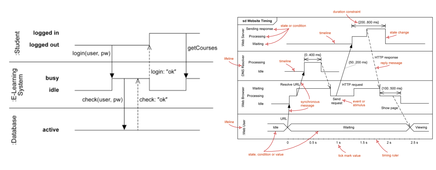 - 타이밍 다이어그램(Timing Diagram)은 주어진 시간 동안 객체들의 행동 변화를 보여줌