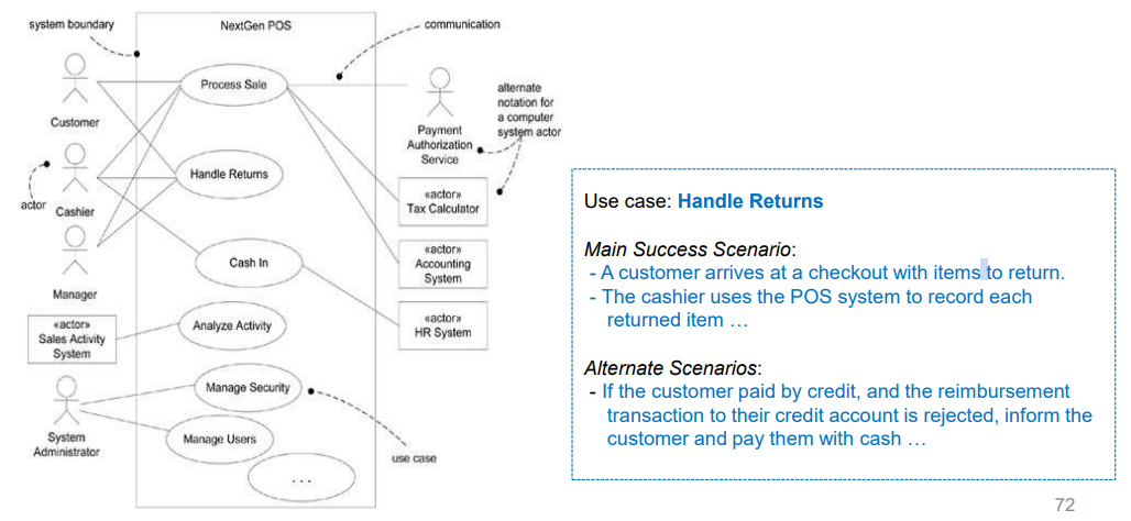 - Primary Actor(주 액터) : 시스템을 사용해 목표를 달성하는 주체 (예: 계산원)