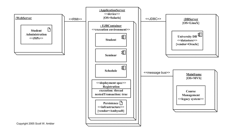 - 실행 시점의 하드웨어 노드 구성과 그 위에서 동작하는 소프트웨어 구성 요소들을 정적인 관점에서 보여줌