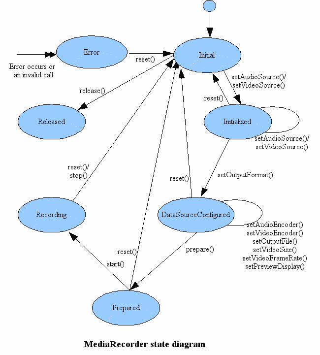 예를 들어 재생(Started) 상태가 되기 위해선, Idle - Initialized - Prepared - Started 의 과정을 거쳐야 한다. 즉, 아래의 함수들이 실행되어야 한다.