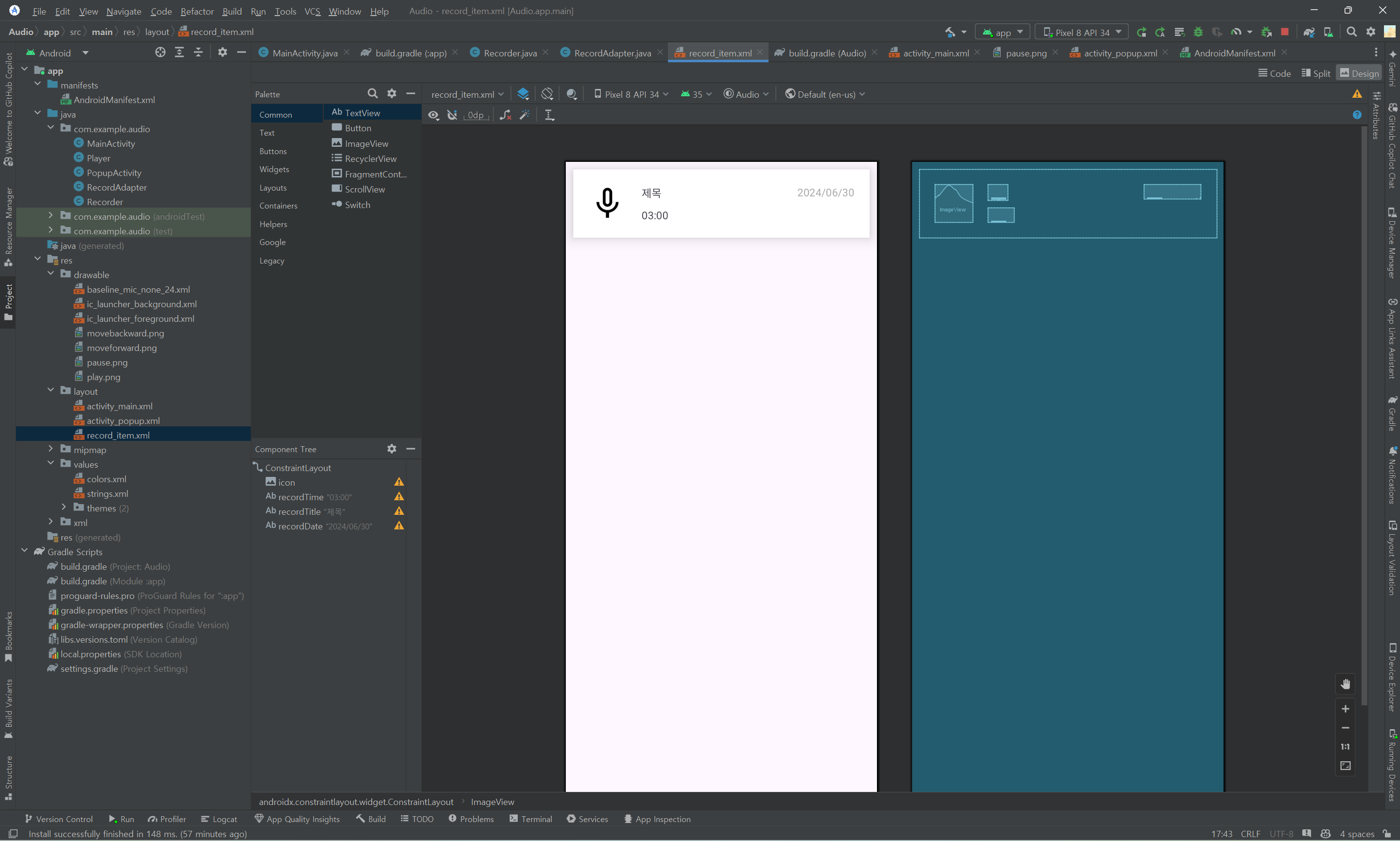 녹음 이미지, 제목, 파일 길이, 녹음 날짜를 띄울 수 있는 item을 생성한다.