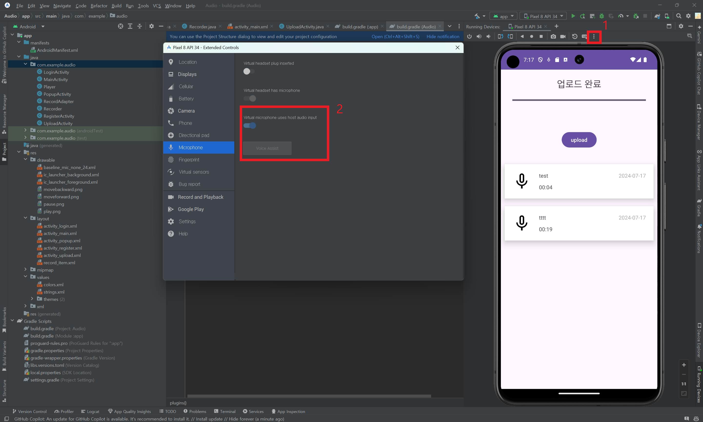 에뮬레이터에서 마이크를 사용하기 위해서 host(컴퓨터)의 마이크와 연결해주는 과정이 필요하다. 에뮬레이터를 실행할 때 나오는 "..."을 누른 후, 다음의 버튼을 활성화해준다.