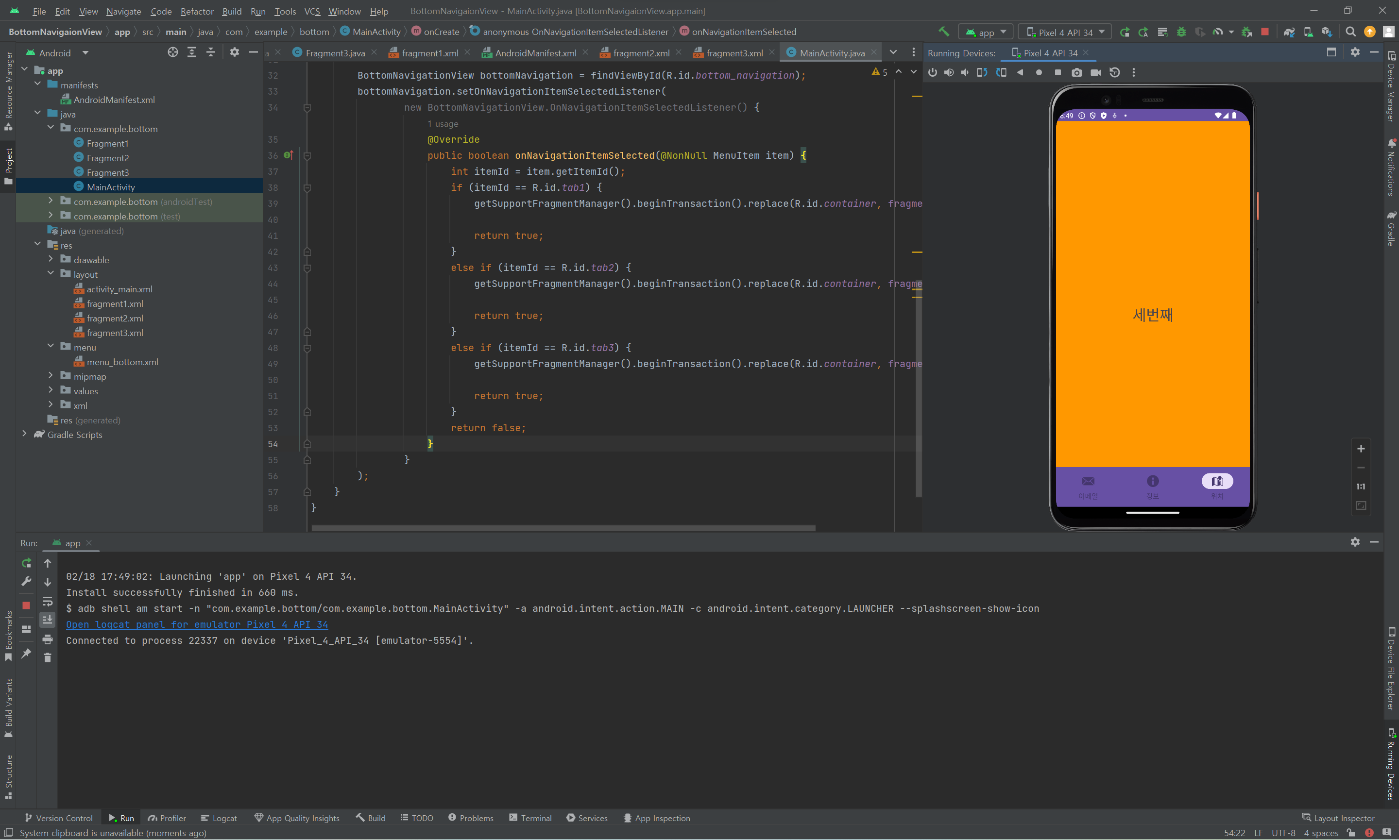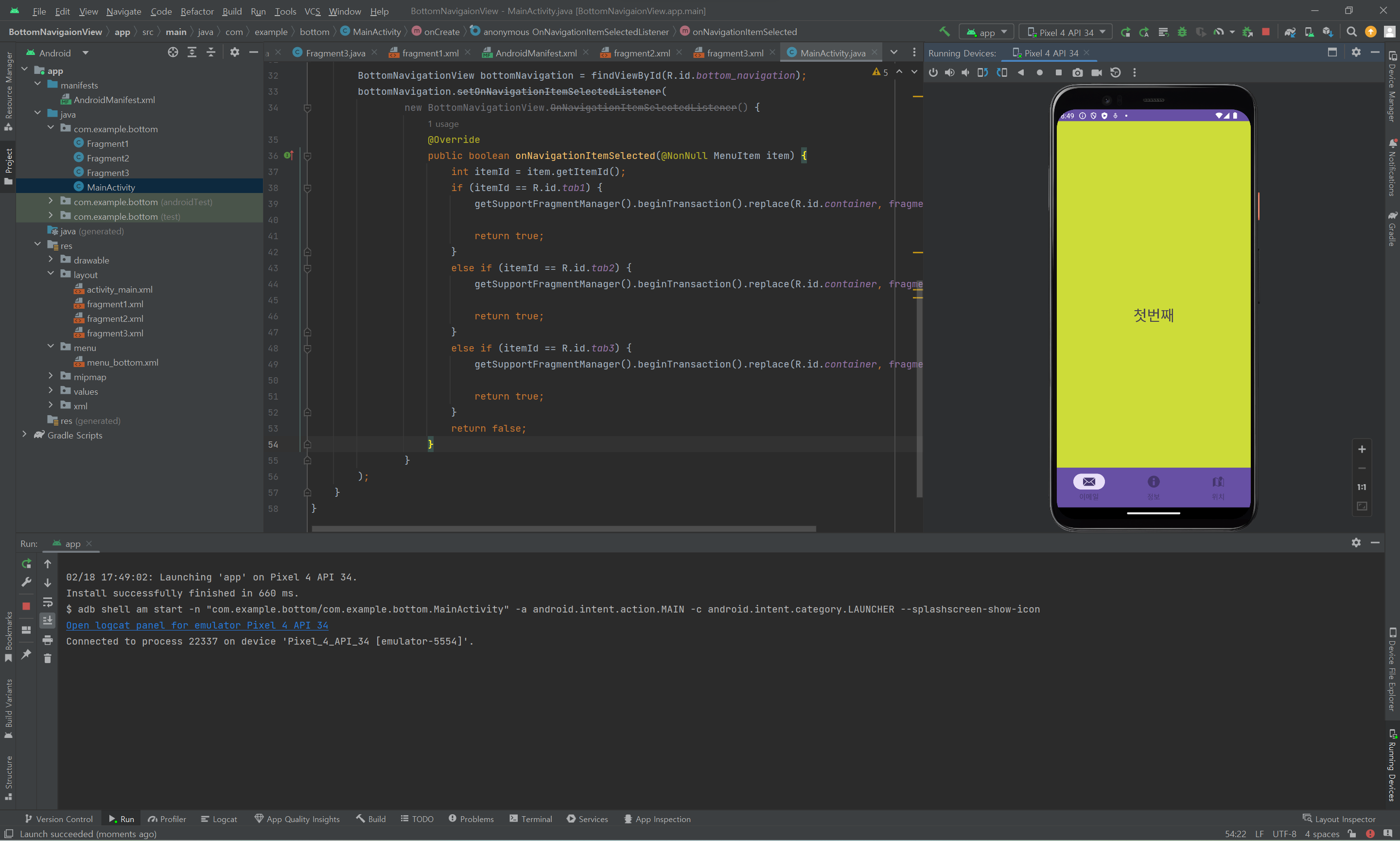 이제 MainActivity.java 파일에서 BottomNavigationView의 item을 클릭했을 때 어떤 동작을 할지 코딩해주면 된다. 기본적인 버튼 연결과 유사하게 진행되지만, BottomNavigationView의 클릭된 item에 따라 다른 동작을 수행하도록 해야한다.
