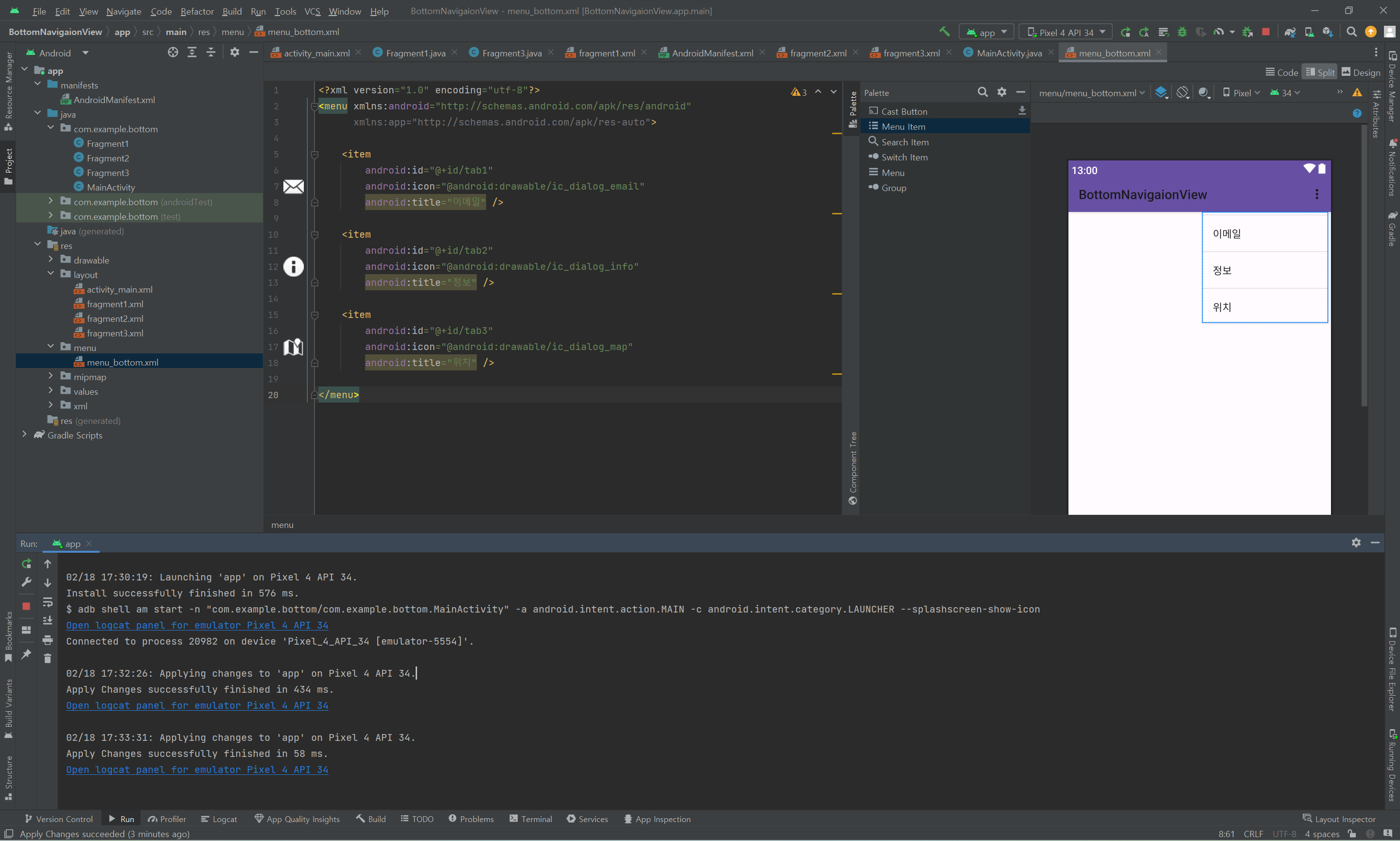 약간의 팁이 있는데, FrameLayout이 전체 화면에 해당하므로, Fragment 화면의 아래 부분은 하단바에 의해 가려지게 된다. 따라서 앱의 디자인을 편하게 하기 위해서, 하단바를 띄울 Fragment의 xml에 전부 하단바를 추가하는게 좋다.