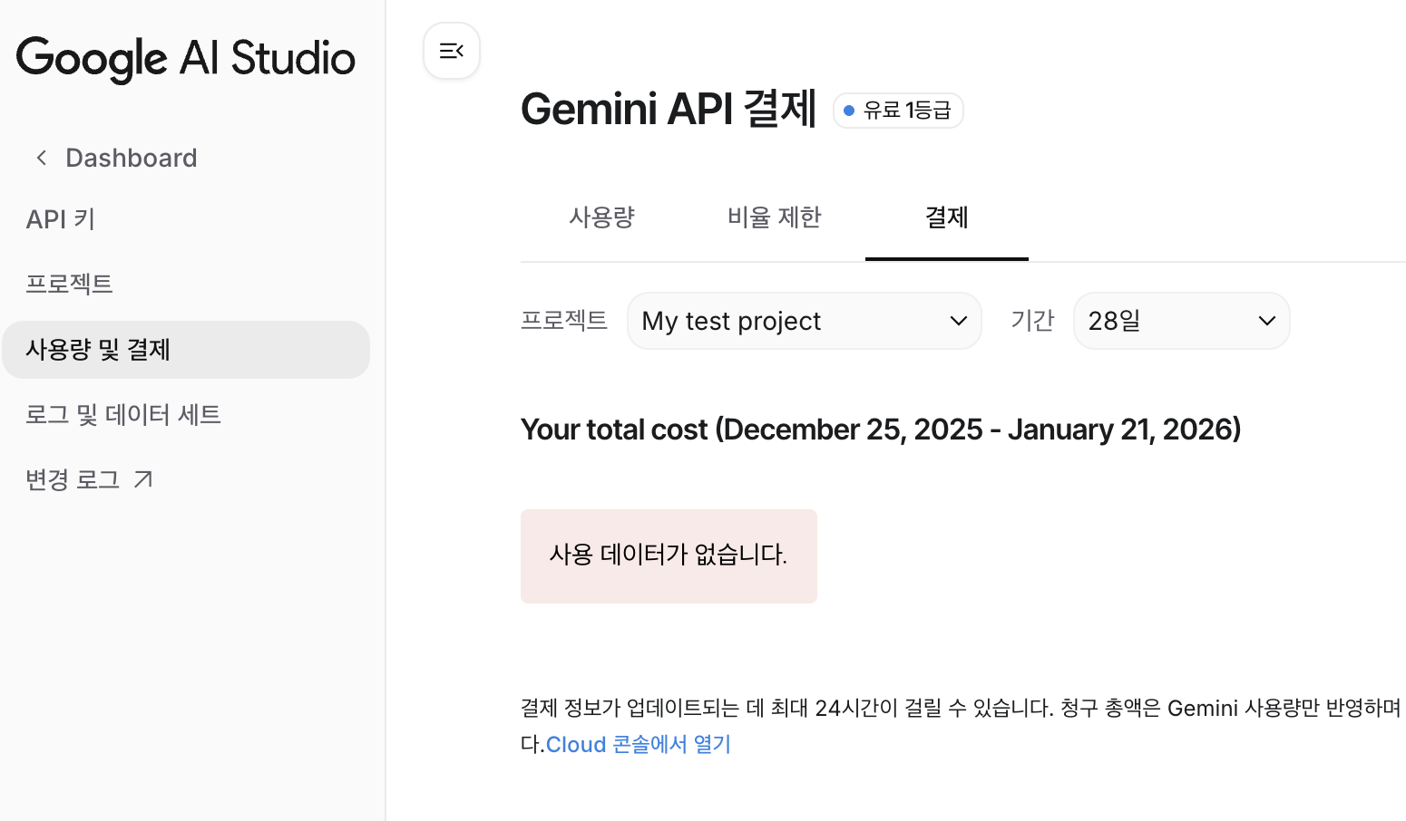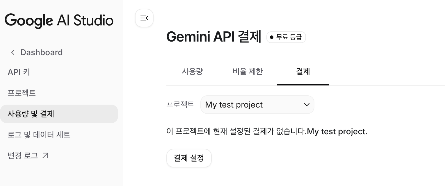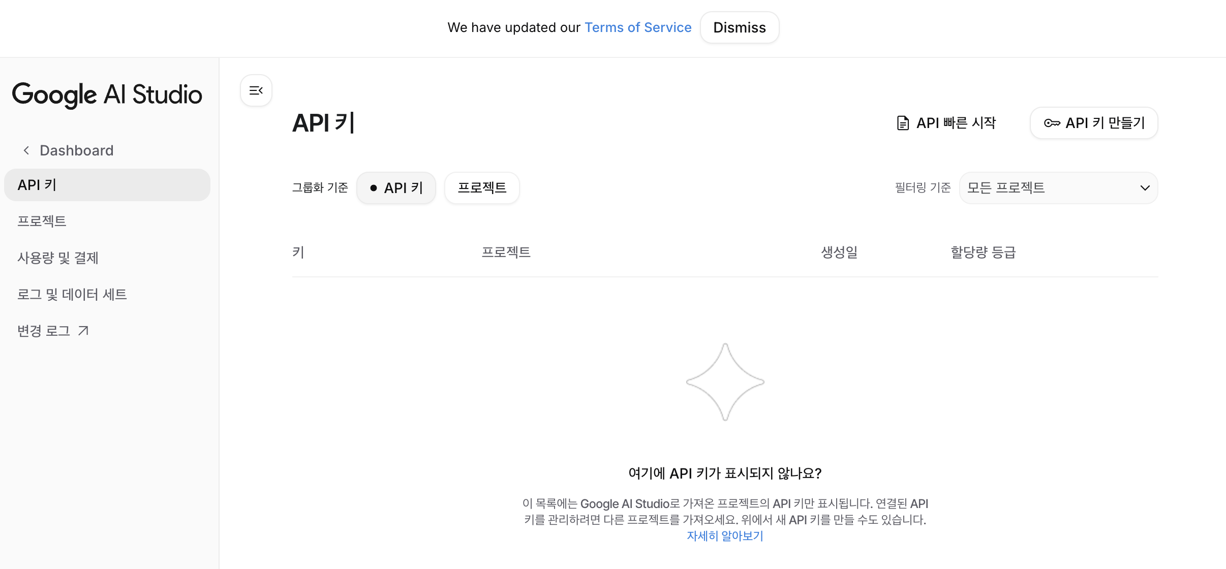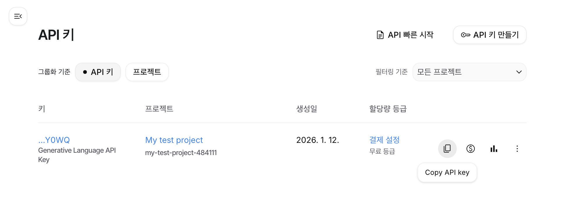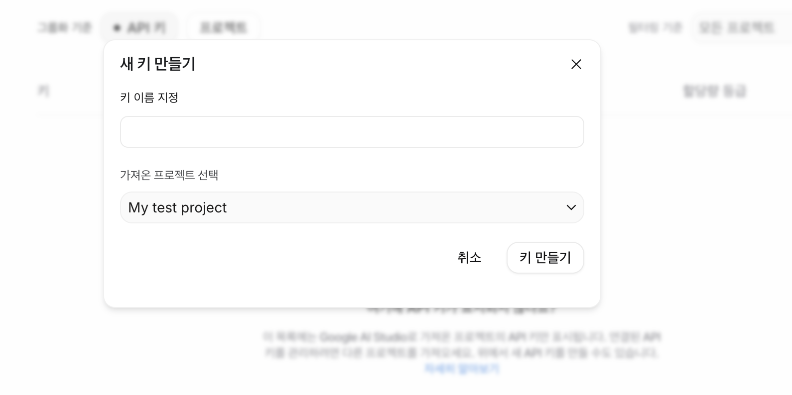 이제 키를 발급받기 위해서 Google AI Studio 사이트에 들어가고, API 키 만들기 > 프로젝트 가져오기 > 생성한 프로젝트 클릭한 후, 키 만들기를 클릭한다.