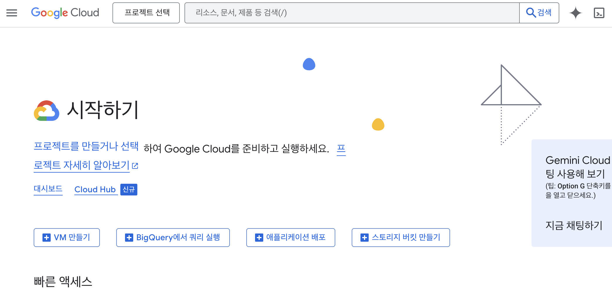 Gemini API 키를 발급받기 위해선 프로젝트를 생성해야 한다. Google Cloud 사이트에 접속한 뒤, 프로젝트 선택을 선택한다.
