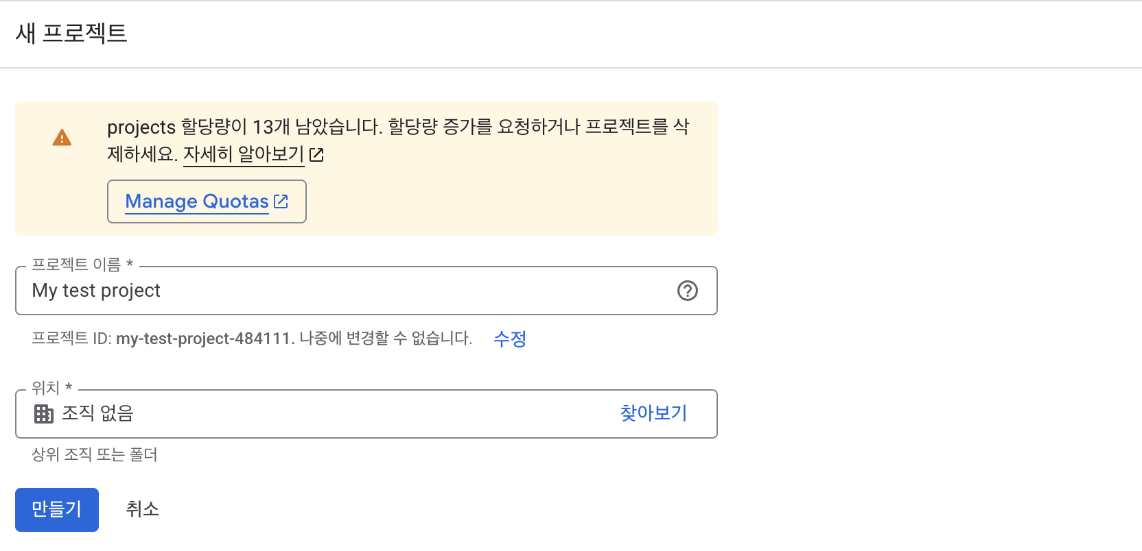 이후 새 프로젝트 버튼을 누른 후, 아래와 같이 프로젝트를 생성한다.