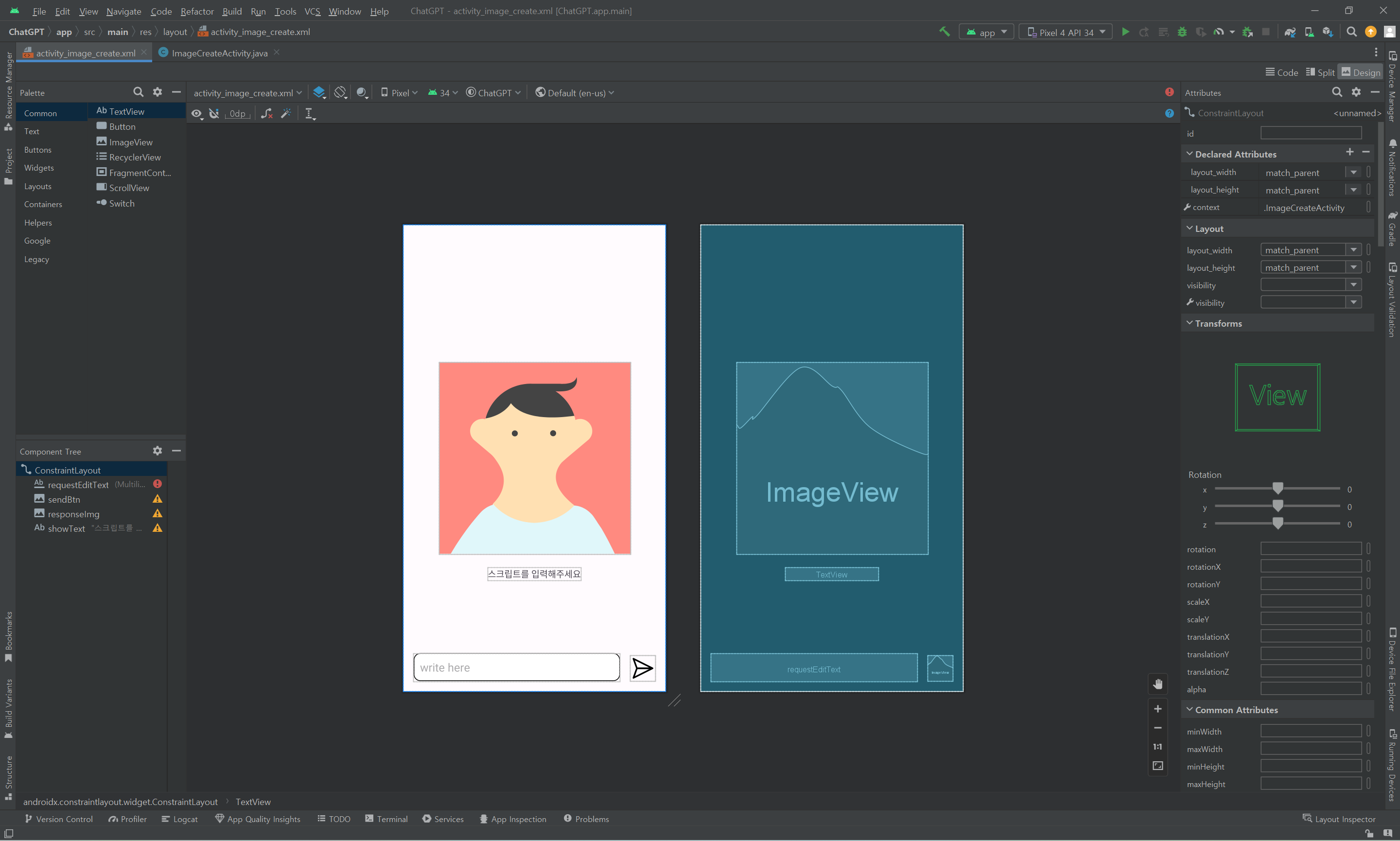 먼저 onCreate함수에서는 앞서 설정한 send 버튼을 클릭 시 editText의 내용을 지움과 동시에 dall-e-3에게 응답을 보내는 코드를 구현한다. 아래의 코드에서 callAPI함수는 나중에 구현한다.