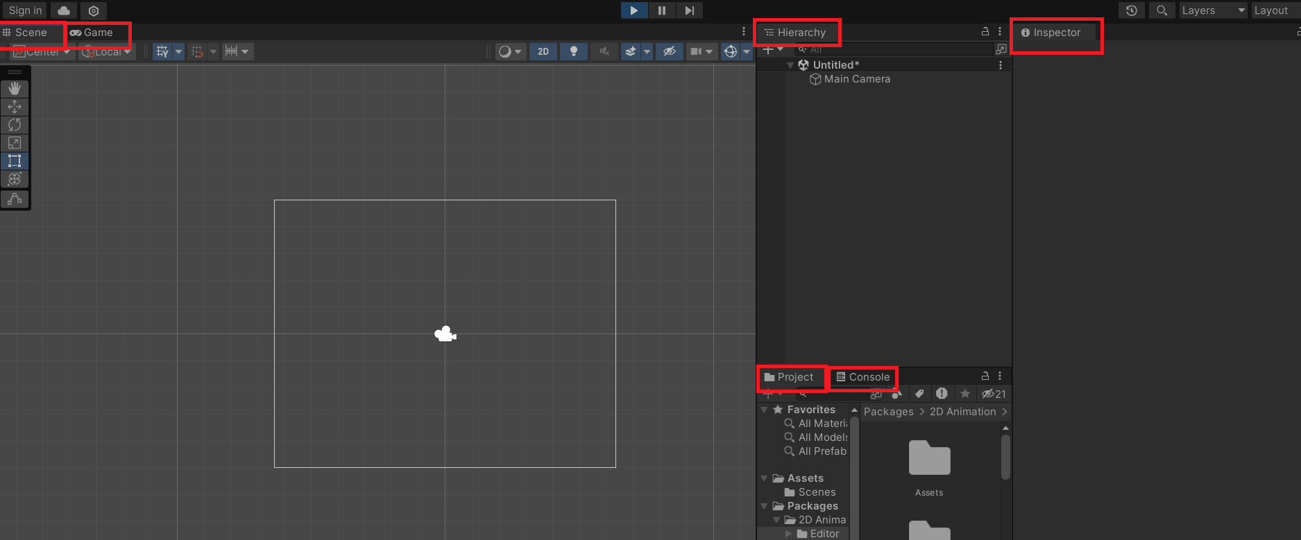 Game View : Scene의 모습은 보여준다. Scene View는 수정하고 있는 Scene의 전체 화면을 보여준다면, Game View는 카메라안에 담겨있는 모습만 보여준다.(Scene Veiw에서 네모 박스는 카메라를 의미한다.)