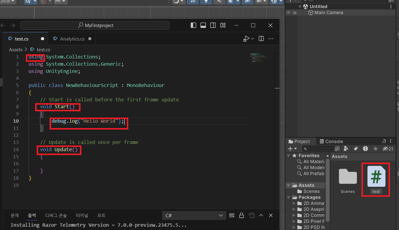 2. 맨 위 메뉴바에 Assets메뉴 클릭 -> Create 메뉴 -> C# Script 클릭 => Script 생성