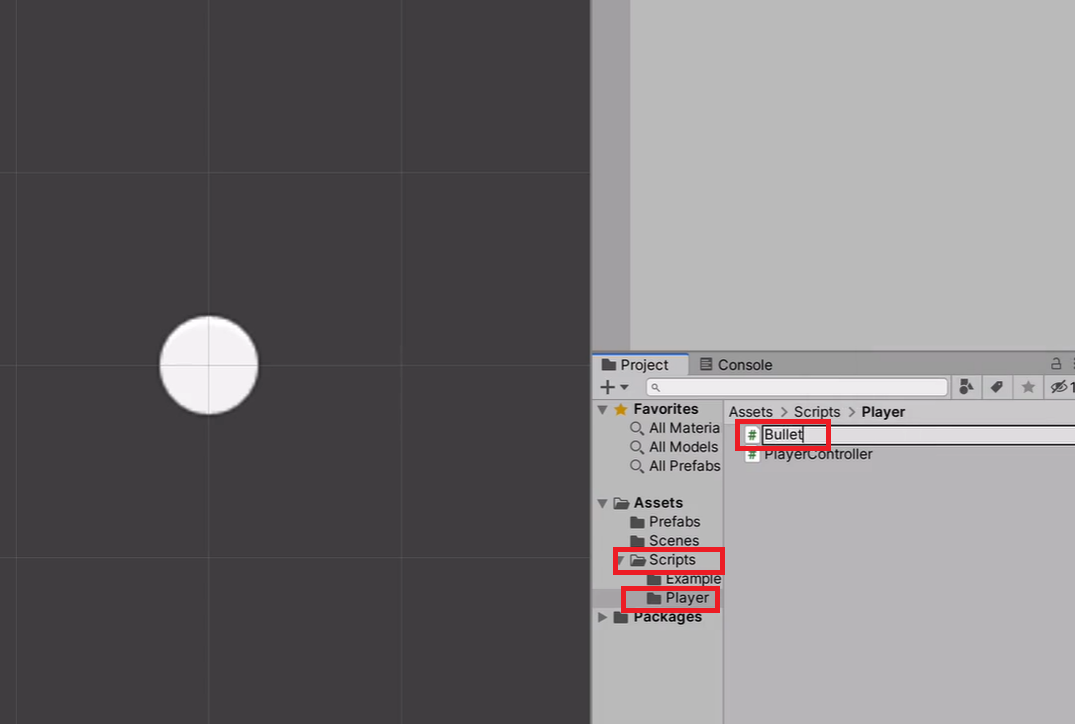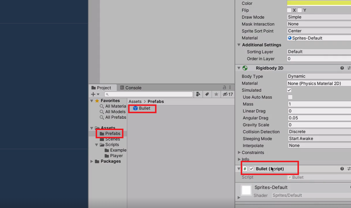 Scripts-Player folder에 Bullet Script를 생성한다. -> Prefabs-Bullet의 inspector에 Bullet Script를 추가한다.