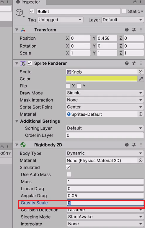 ** bullet이라는 gameobject가 밑으로 떨어지지않게. 즉, 중력이 가하지 않도록 하기 위해서 Gravity Scale의 값을 0으로 설정한다.