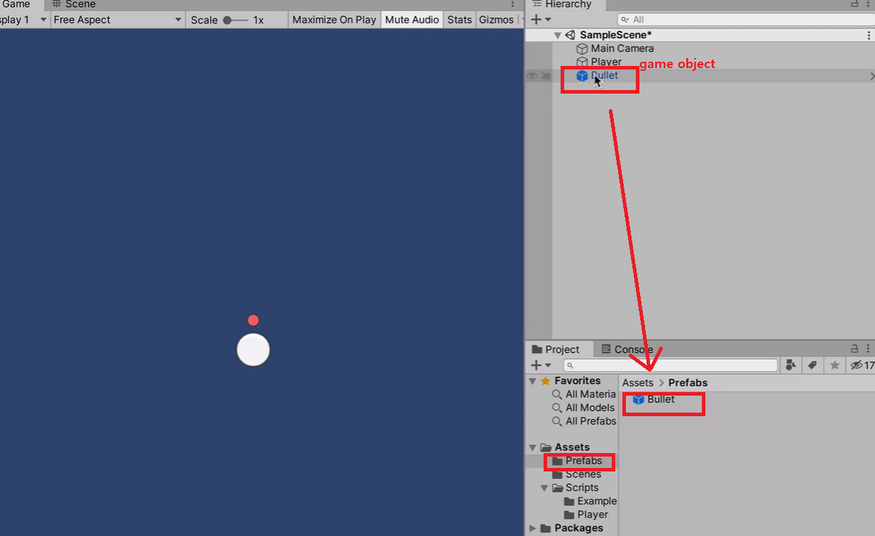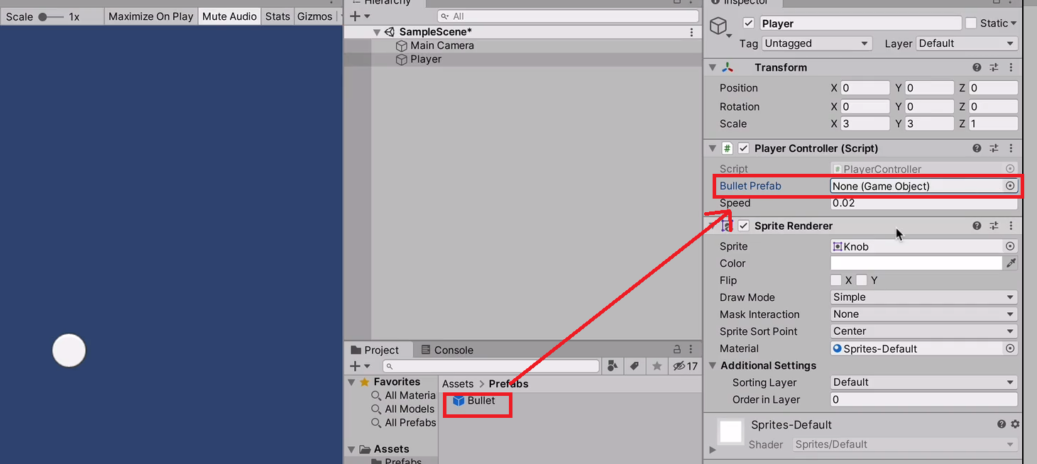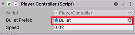 ** Hierarchy에 있는 gameobject가 아닌 asset folder안에 있는 frefab asset을 Player Controller의 Bullet Prefab에 담아야한다.