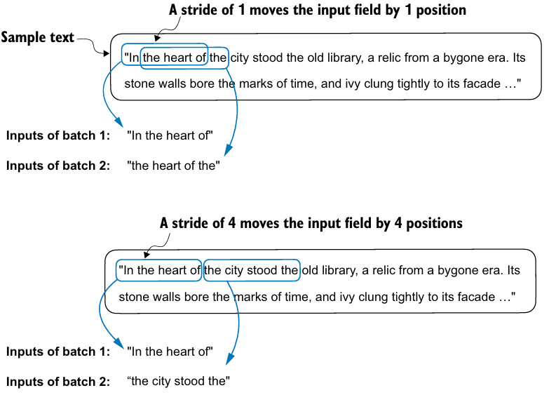 context_size를 지정하여 sliding window 방식을 사용할 수 있고, stride의 변화에 따라 overlap되는 word 개수를 지정할 수 있다.