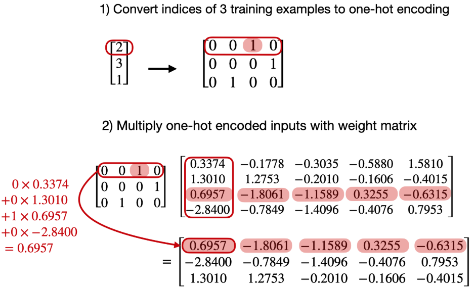 torch.nn.Linear와 행렬 곱셈을 통해서도 임베딩 레이어를 구현할 수 있다.