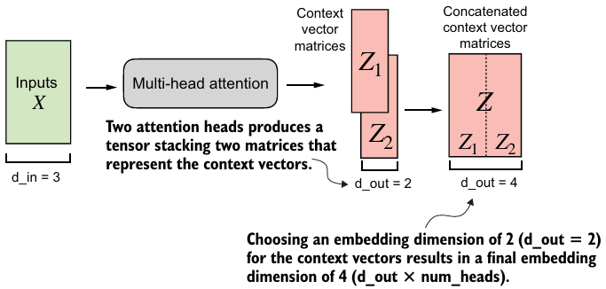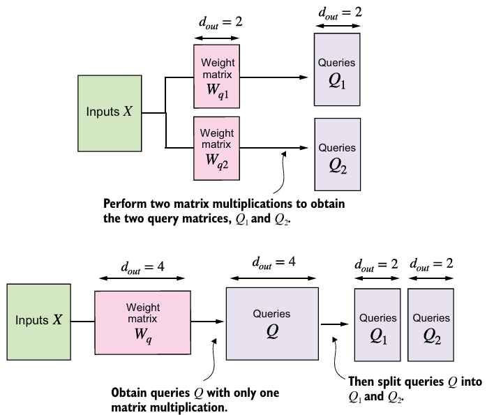 CausalAttention을 여러 개 감싸지 않고MultiHeadAttention이라는 독립형 클래스를 작성할 수 있고, 단일 attention heads를 합치지 않고 단일 , , 가중치 행렬을 생성하여 이를 각 attention head에 대한 개별 행렬로 나눌 수 있다.