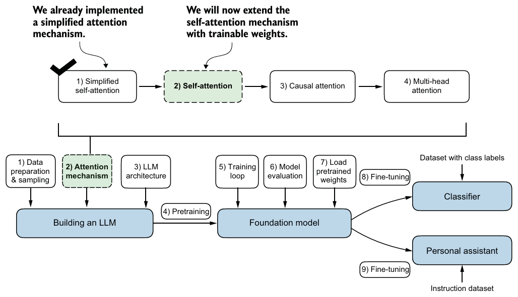 MultiHeadAttentionWrapper과 MultiHeadAttention의 차이이다.MultiHeadAttentionCombinedQKV 클래스는 단일 가중치 행렬(self.qkv = nn.Linear(d_in, 3 * d_out, bias=qkv_bias))을 사용하며, 이를 통해 query, value, key를 계산한다. q, k, v = qkv.unbind(0)를 통해 각 값을 얻는다.torch.einsum을 사용하여 Einstein summation을 구현한다.scaled_dot_product_attention와 self-attention의 메모리 최적화된 버전인 FlashAttention을 사용한다.context_vec = nn.functional.scaled_dot_product_attention( queries, keys, values, attn_mask=None, dropout_p=use_dropout, is_causal=True)를 통해 context vector를 얻는다. if self.context_length >= num_tokens: